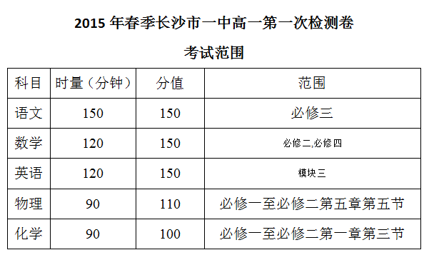 2015年春季長沙市一中高一第一次檢測卷范圍