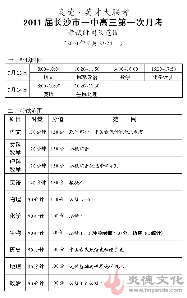 炎德英才大聯(lián)考長(zhǎng)沙市一中2011屆高三第一次月考考試時(shí)間和范圍
