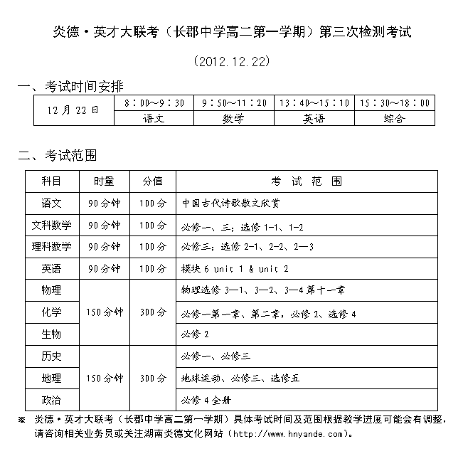 2012年秋季長郡中學高二第三次月考時間范圍(2012.12.22)