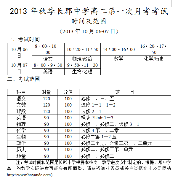 2013年秋季長郡中學高二第一次月考考試時間和范圍(2013.10.06-07)