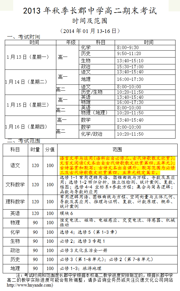2013年秋季長郡中學高二期末考試時間和范圍(2014.01.13-16)