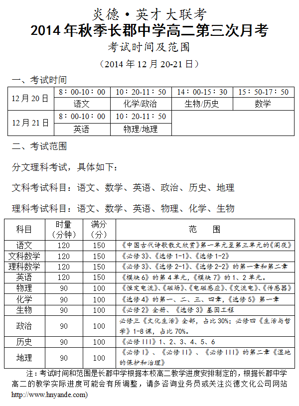 炎德英才大聯考2014年秋季長郡中學高二第三次月考考試時間和范圍(2014.12.20-21)