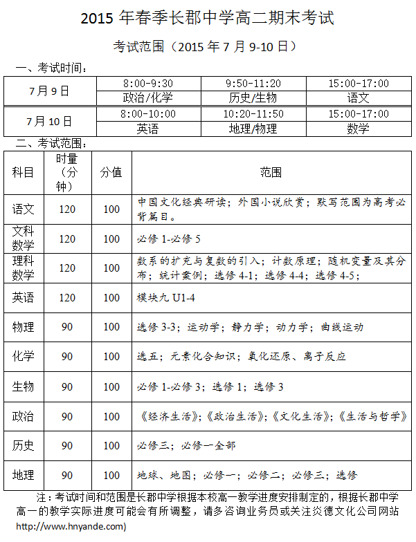 2015年春季長(zhǎng)郡中學(xué)高二期末考試考試范圍(2015年7月8-10日)
