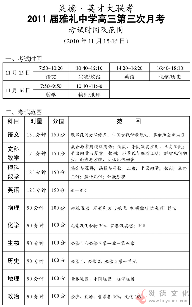 炎德英才大聯考雅禮中學2011屆高三第三次月考考試時間和范圍