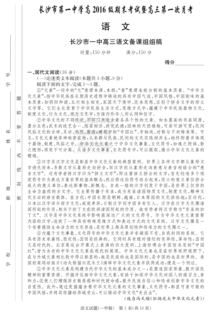 【語文】炎德英才大聯考2019長沙一中高三1次月考