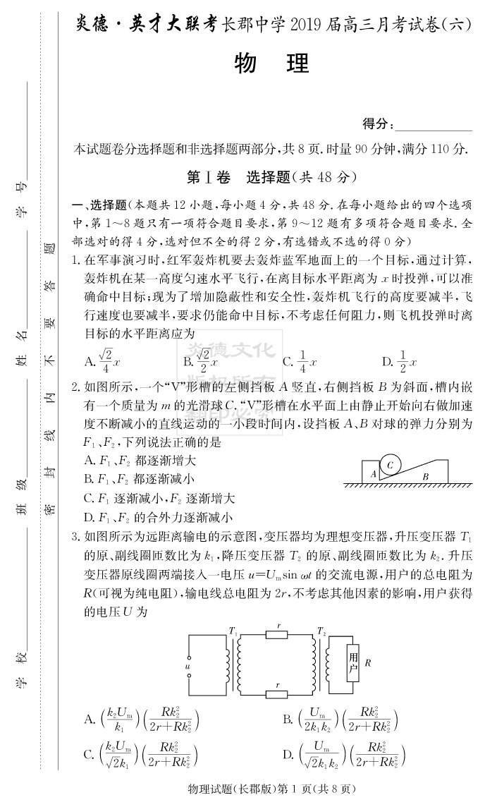 【物理】炎德英才大聯(lián)考2019長(zhǎng)郡中學(xué)高三6次月考