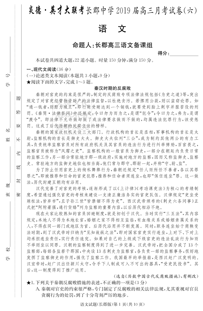 【語文】炎德英才大聯(lián)考2019長郡中學(xué)高三6次月考