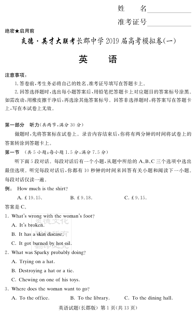 【英語(yǔ)】炎德英才大聯(lián)考2019長(zhǎng)郡中學(xué)高三9次月考(模擬一)