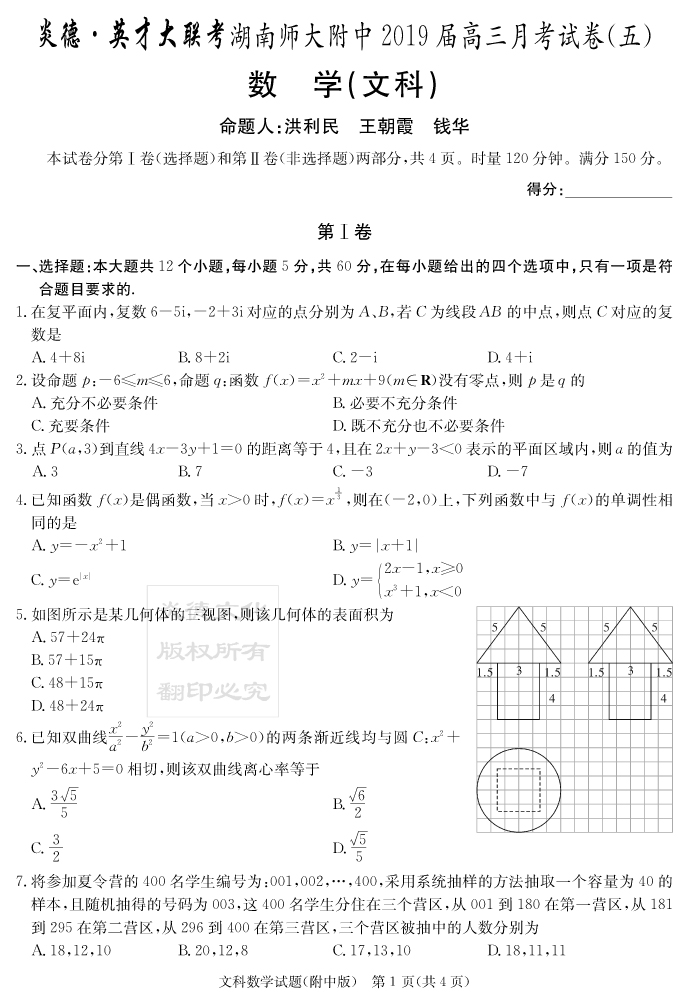 【文數】炎德英才大聯考2019師大附中高三5次月考