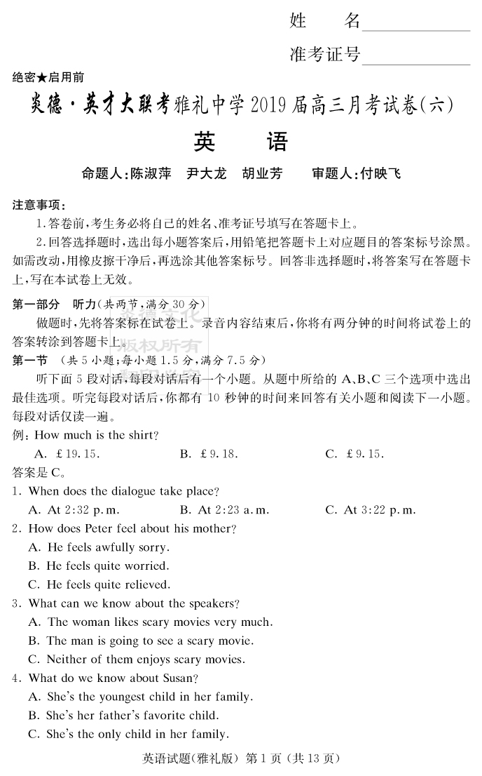 【英語(yǔ)】炎德英才大聯(lián)考2019雅禮中學(xué)高三6次月考