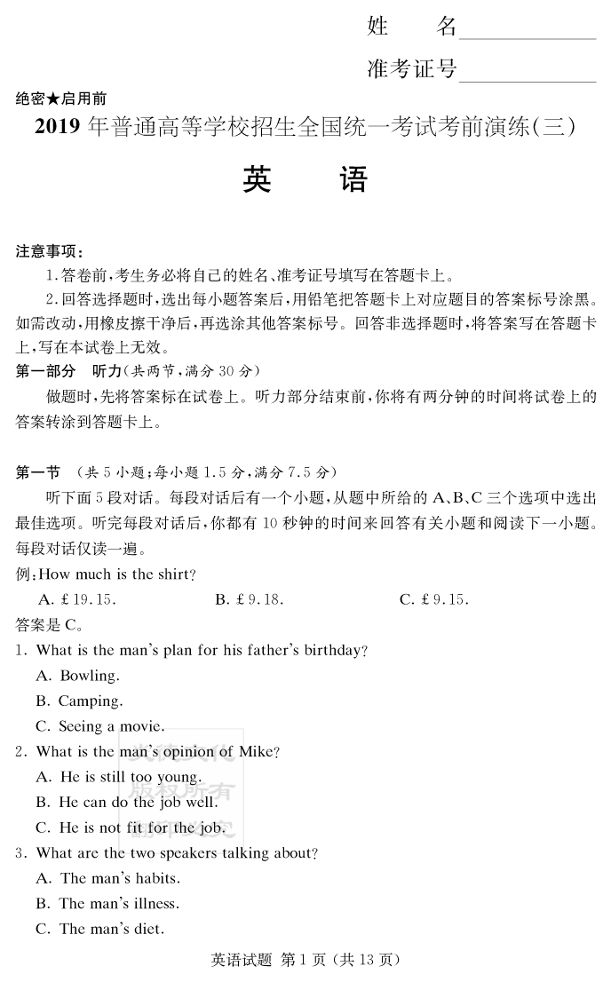 【英語】2019年普通高等學校招生全國統一考試考前演練(三)