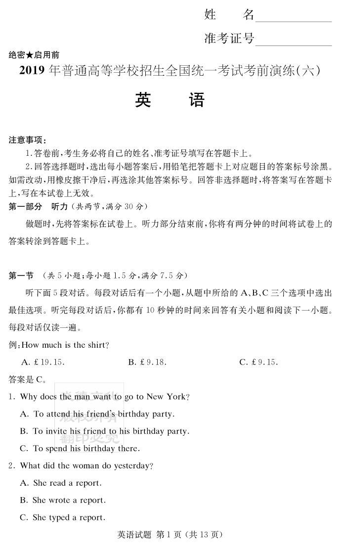 【英語(yǔ)】2019年普通高等學(xué)校招生全國(guó)統(tǒng)一考試考前演練(六)
