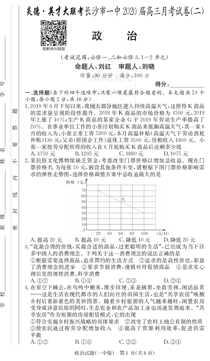 【政治】炎德英才大聯考2020屆長沙市一中高三2次月考