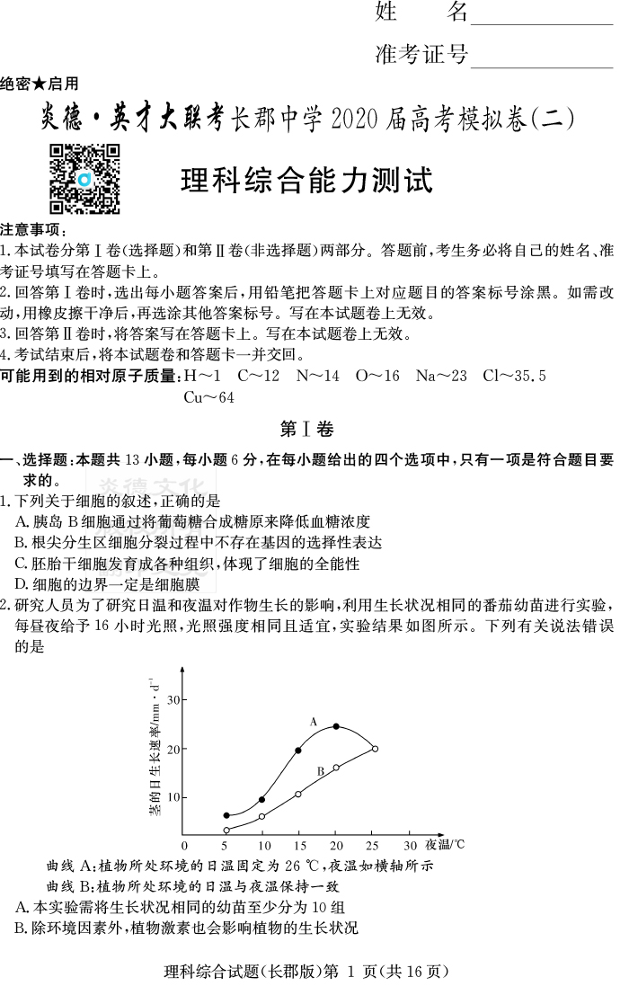 【理綜】炎德英才大聯考2020屆長郡中學高三10次月考(模擬二)