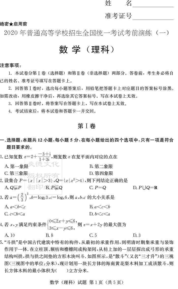 【理數】2020年普通高等學校招生全國統一考試考前演練(一)