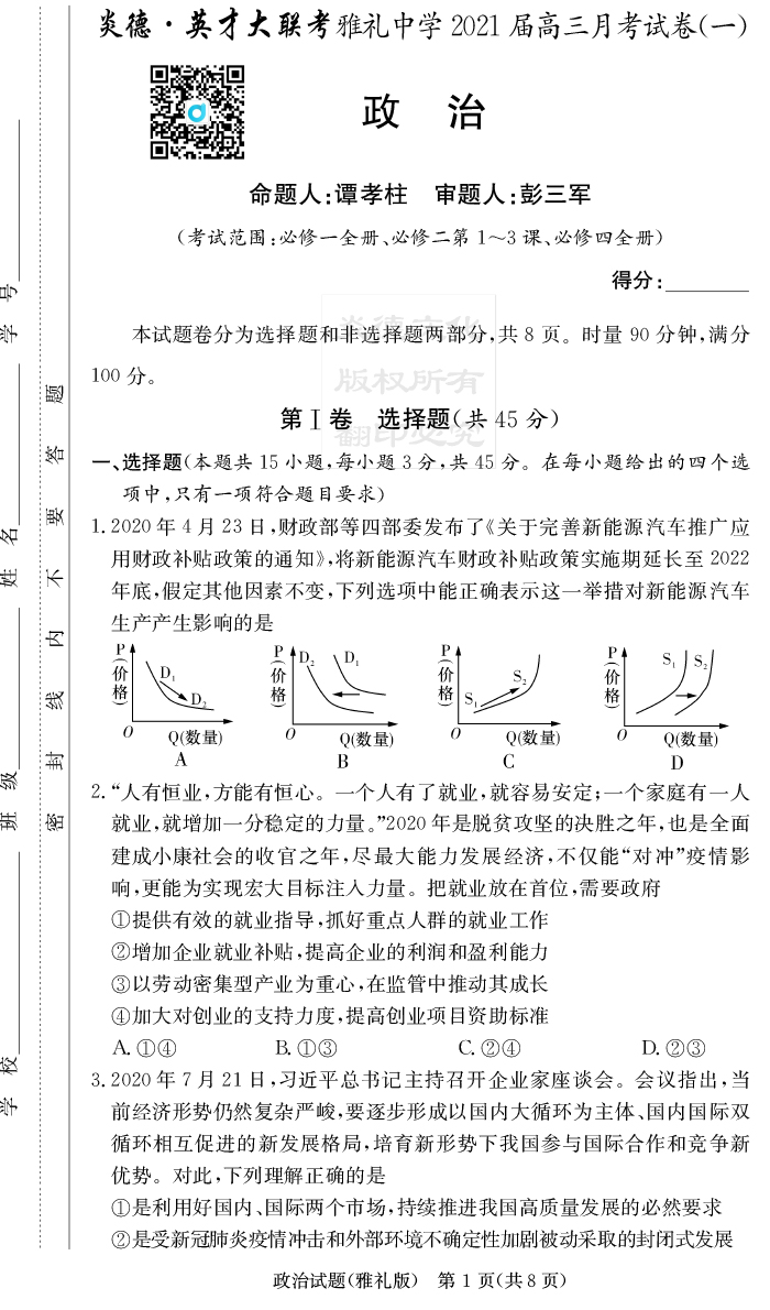 【政治】炎德英才大聯(lián)考2021屆雅禮中學(xué)高三1次月考