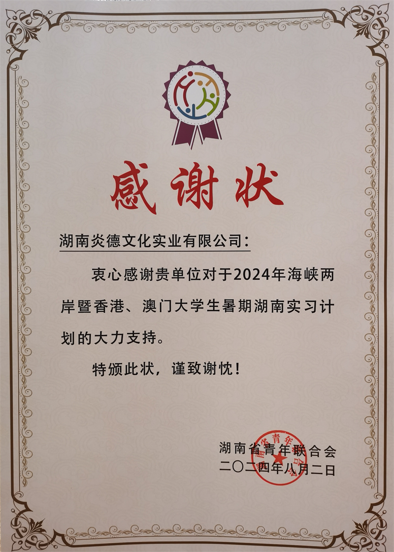 湖南炎德文化實業(yè)有限公司獲2024年港澳臺大學(xué)生暑期湖南實習(xí)計劃“感謝狀”