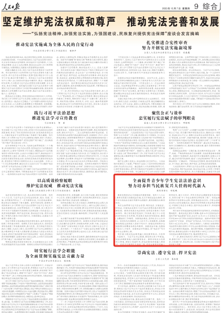 下一步,教育系統(tǒng)將深入貫徹習近平總書記重要指示精神,教育引導廣大青少年學生成為社會主義法治的忠實崇尚者、自覺遵守者、堅定捍衛(wèi)者,為實現(xiàn)中華民族偉大復興作出新的更大貢獻。(“弘揚憲法精神,加強憲法實施,為強國建設、民族復興提供憲法保障”座談會發(fā)言摘編 本文刊發(fā)于《人民日報》2023年12月07日第09版)